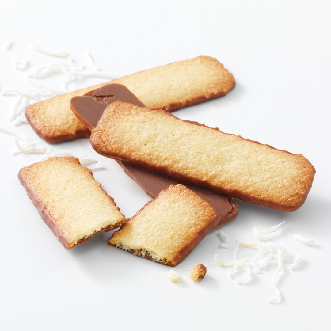 じっくりとローストしたココナッツを混ぜ、こんがりキツネ色に焼き上げたクッキー。片面にはチョコレートをコーティングしました。さくさくとした軽快な歯ごたえと、香ばしくまろやかな風味をお楽しみください。