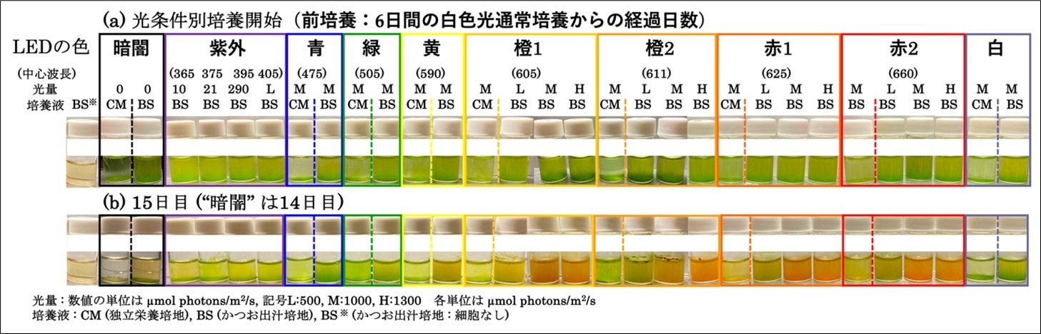 培地の組成、照射光の波長、光量の3つの観点から、ユーグレナ細胞の赤色化を促す適切な条件を探索しました。具体的には、培地は独立栄養培地であるCM培地、従属栄養培地であるKH培地に加え、かつお出汁からなるBS(bonito stock)培地を作成し、紫外(365 nm)から赤色(660 nm)までの単色光または白色光を、光量を変えて照射し、ユーグレナ細胞の赤色化および増殖について調べました。その結果、強い赤色光照射(605 ~ 660 nm、1000 ~ 1300 μmolphotons/m2/s)を照射し、BS培地で培養した場合、最もユーグレナの赤色化が進むことが明らかになりました。