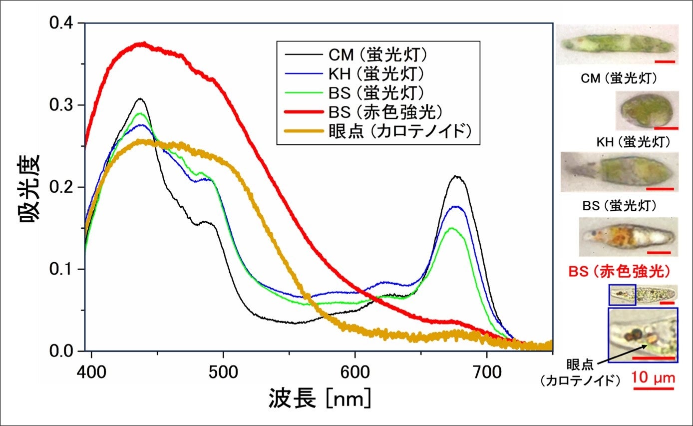 赤色化した細胞懸濁液の物質構造を分析するため懸濁液に光を照射し、その吸収スペクトルを測定した結果、懸濁液の赤色化は、緑色色素であるクロロフィルaの含有量に対するカロテノイドの増加によるものであり、ユーグレナはCM培地よりもBS培地でより多くの種類または量のカロテノイドを産生していることが示唆されました。