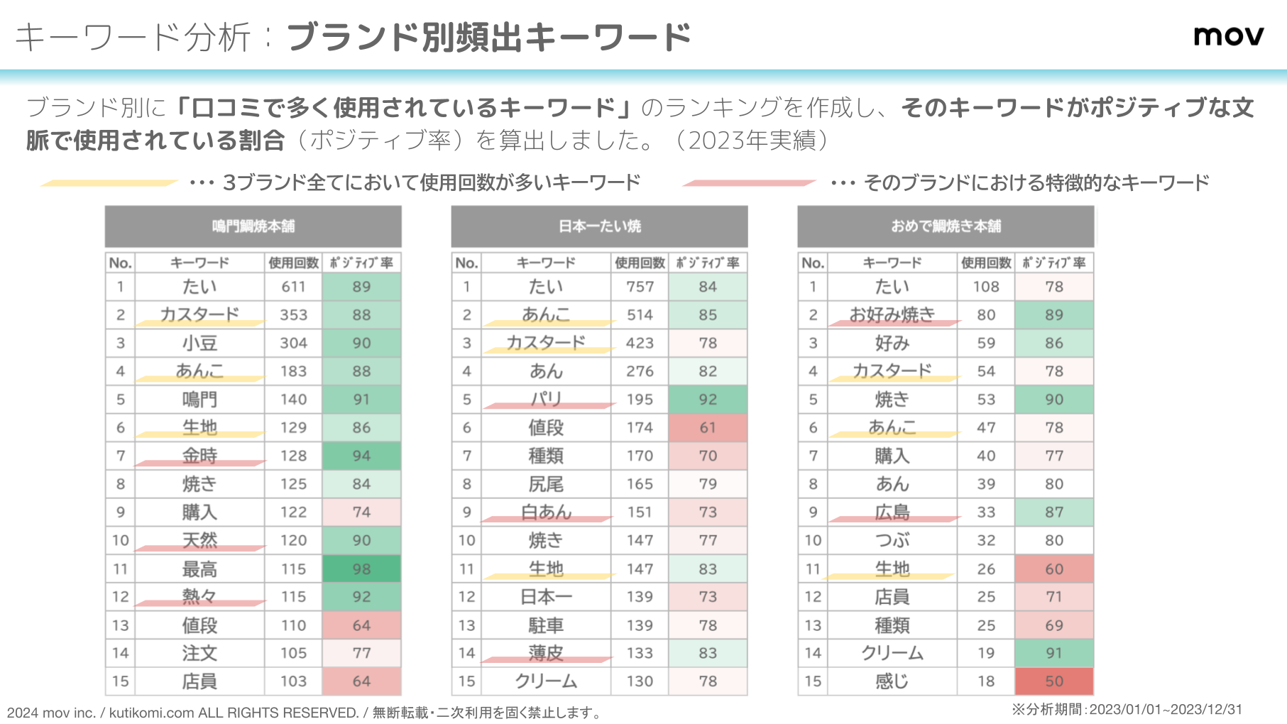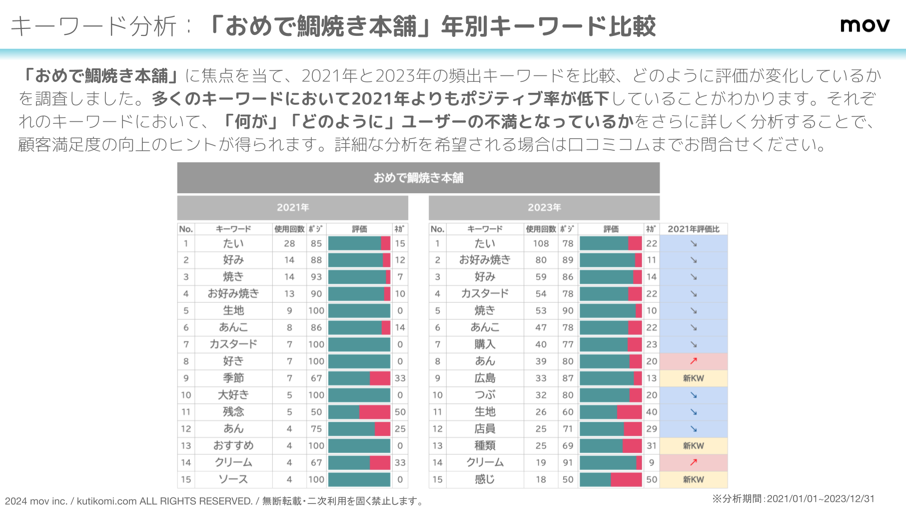 「おめで鯛焼き本舗」に焦点を当て、2021年と2023年の頻出キーワードを比較、どのように評価が変化しているかを調査しました。