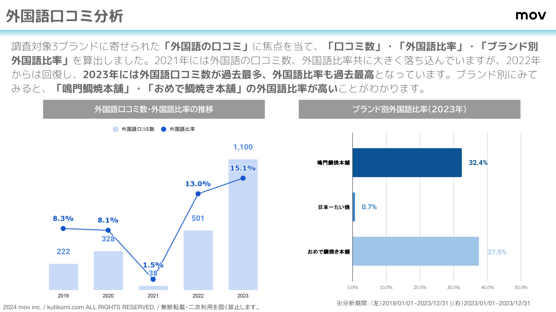 ■ 2023年は口コミの外国語比率が急増、もっとも外国語比率が高かったブランドは「日本一たい焼」