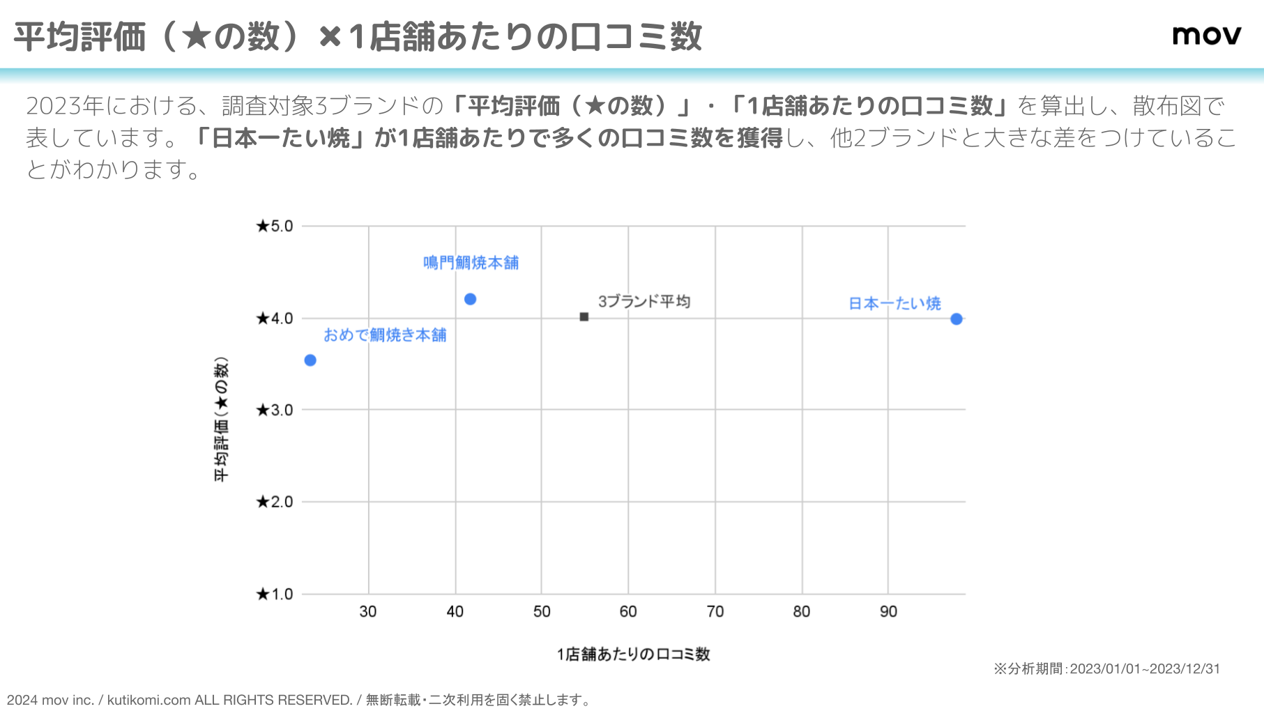 2023年における、調査対象3ブランドの「平均評価(★の数)」・「1店舗あたりの口コミ数」を算出し、散布図で表しています。
