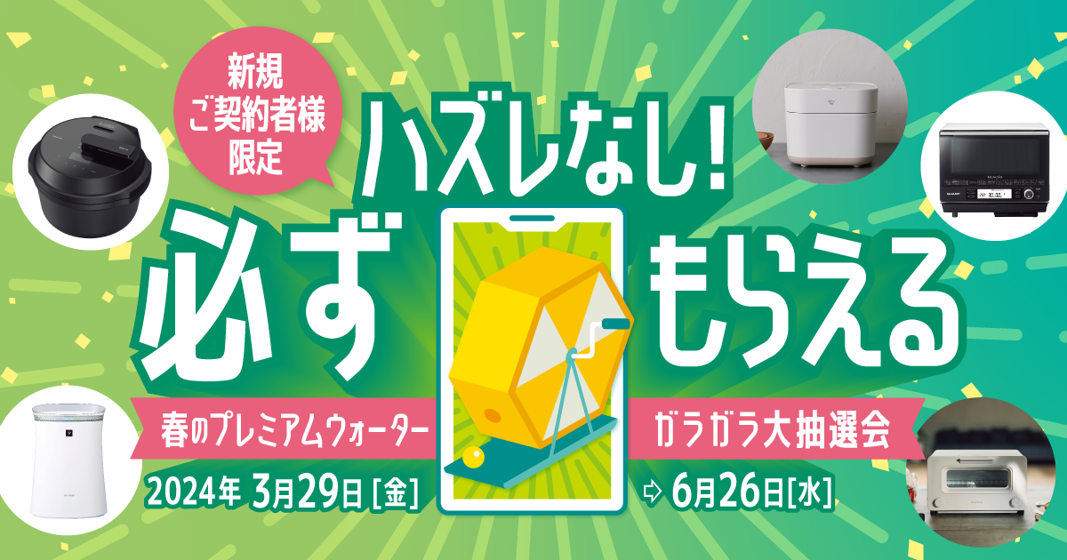 本キャンペーン期間中にプレミアムウォーターを新規でご契約いただくと、豪華商品が当たる『ハズレなし!必ずもらえる!春のプレミアムウォーター ガラガラ大抽選会!』にご参加いただけます。