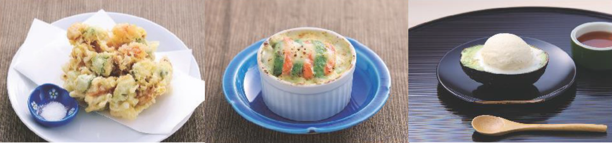 写真左:アボカド海鮮かき揚げ、写真中央:アボカドサーモングラタン、写真左:アボカドカップアイス