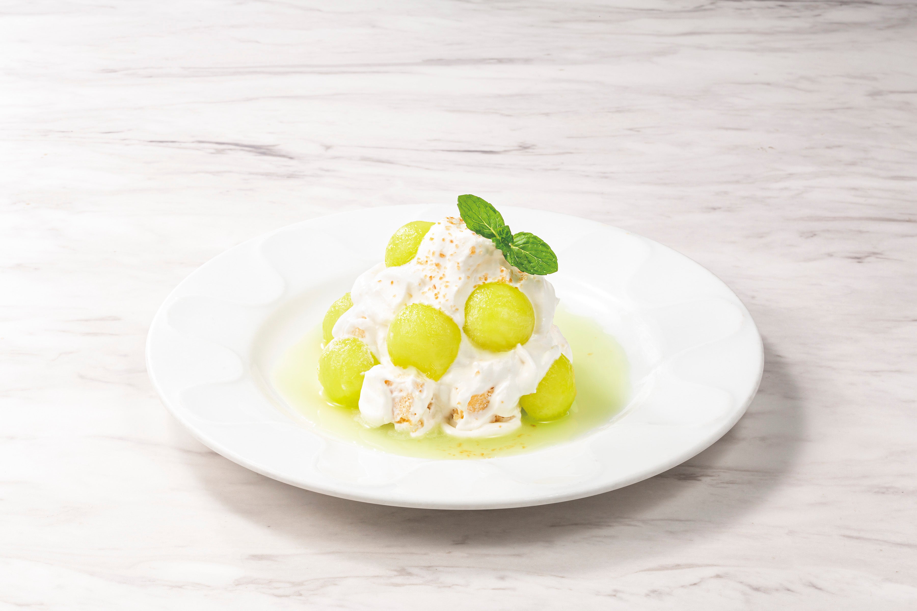 香り高いマスクメロンを贅沢に使用した、リッチな味わいのザ・サンデー。クリーム、ゼリー、ソルベ、ソースと、多彩な素材が織りなすメロンデザートの決定版! まろやかなマスカルポーネクリームやすっきりとしたミルクジェラートも、メロンと相性抜群です。最初の一口から余韻まで、メロンの香りと甘さに包まれる、至福のひとときをご堪能ください。