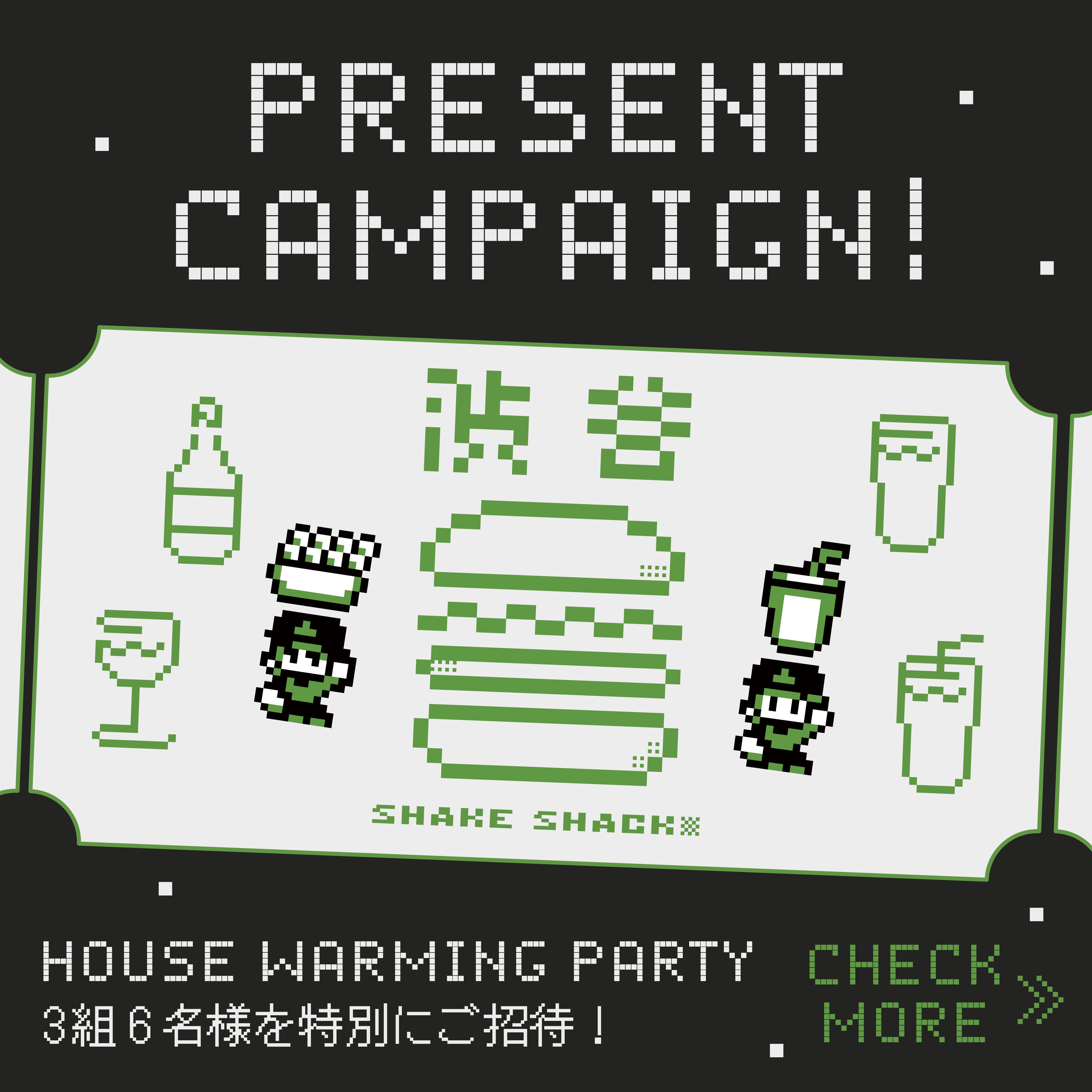 シェイク シャック 渋谷店のOPENをお祝いする“House Warming Party”に参加できるチャンスが当たるキャンペーンとなります。ご応募いただいたフォロワーの中から、3組6名様を4月11日(木) 18:00から開催するパーティーにご招待いたします。当日はシェイク シャックのフードやドリンクが無料で楽しめるほか、おもてなしと遊び心が詰まったパーティーでワクワクとした時間をお過ごしください。ご応募をお待ちしております!
