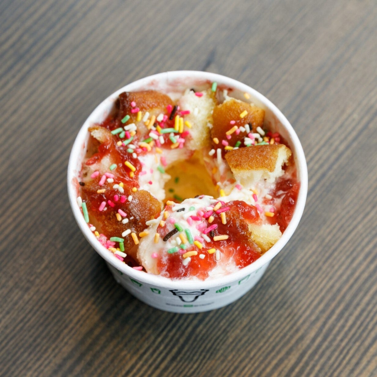 日本国内のシェイク シャックでは、「コンクリート」と呼ばれるアイスデザートの売上から5%を、店舗のチャリティーパートナーに寄付しています。シェイク シャック 渋谷店では、バニラフレーバーのフローズンカスタードをベースに、シュガードーナツ、ストロベリージャム、レインボースプリンクルをトッピングした「レインボーコネクション」の売上から5%を「特定非営利活動法人みんなのおうち」に寄付いたします。