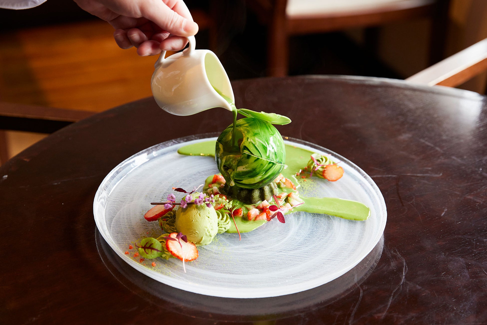 温かい抹茶のソースをかけて召し上がっていただくデザート。