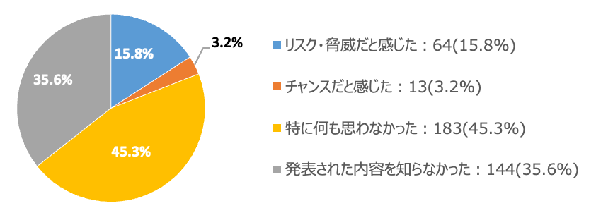また、回答者全員を対象に、「飲酒ガイドライン」についてどのように感じるかを聞いたところ、「リスク・脅威だと感じた」(15.8%)、「チャンスだと感じた」(3.2%)と何らかの意識を持って受け止めている飲食店が約20%いる一方、「特に何も思わなかった」(45.3%)、「発表された内容を知らなかった」(35.6%)という関心がない、情報を知らないといった飲食店が圧倒的に多いことがわかりました。