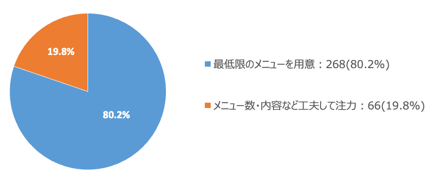 まずは現在ノンアルコール飲料・低アルコール飲料を提供している飲食店に対して、どれくらい積極的に取り扱っているかを聞いたところ、「最低限のメニューを用意している」(80.2%)、「メニュー数・内容など工夫して注力している」(19.8%)という回答が得られました。積極的に提供している店舗の割合は高くはないものの、一定のノンアルコール・低アルコール飲料のニーズがあることがわかります。