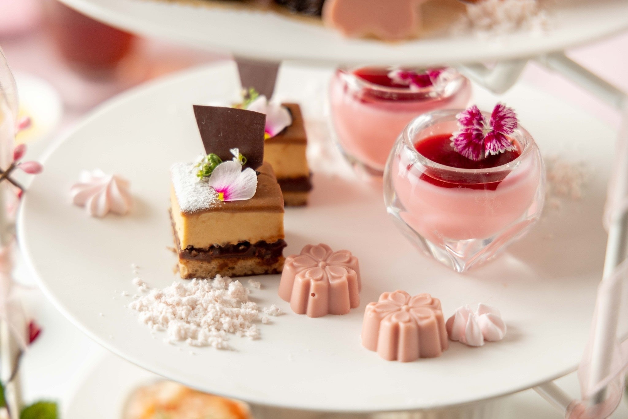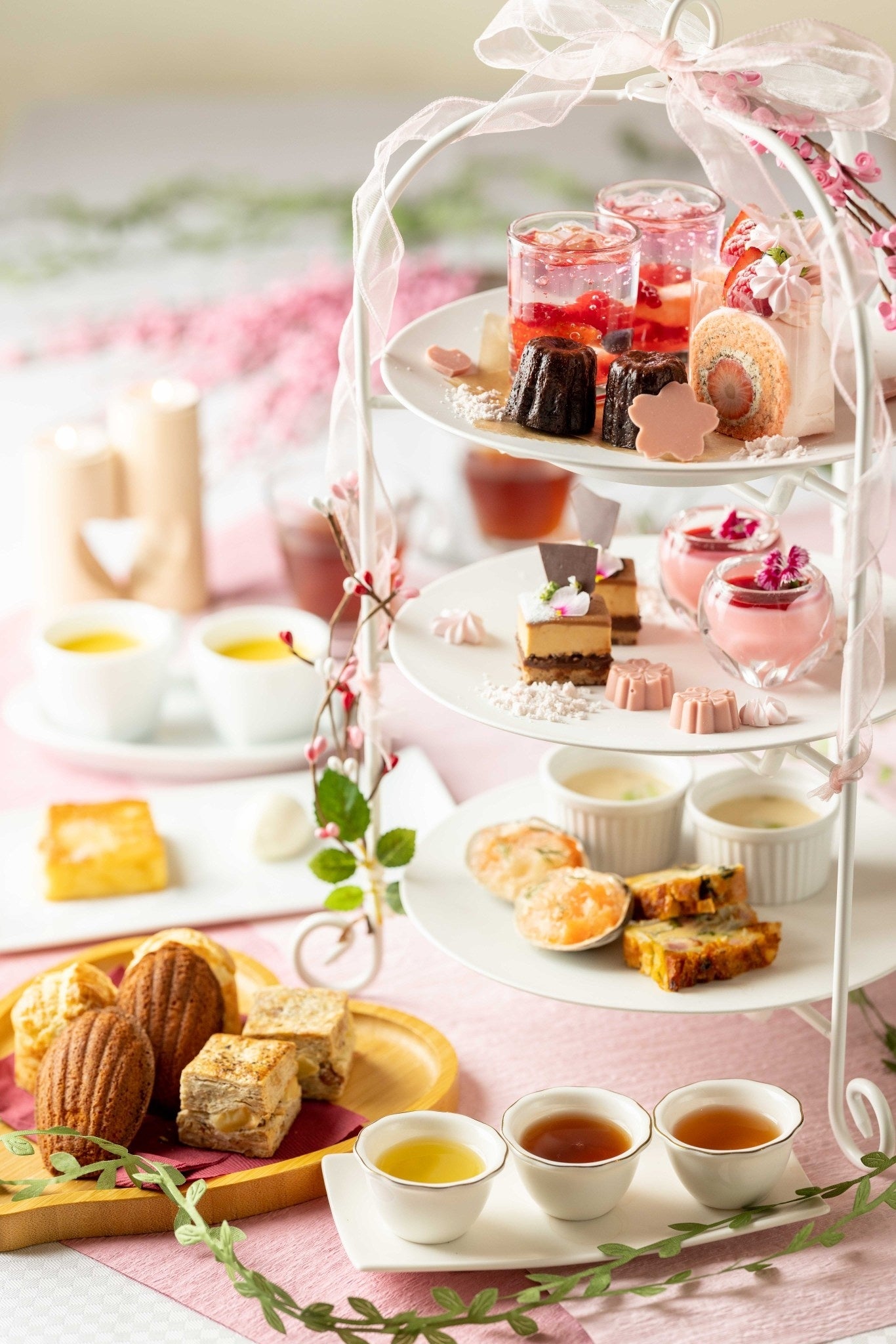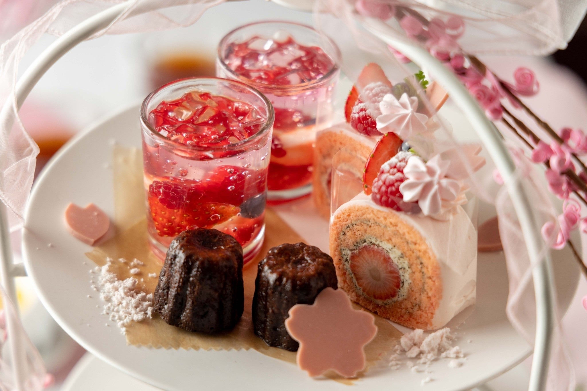 専属パティシエ高橋里沙によるダージリンと桜の絶妙な組み合わせを楽しめるスイーツをご提供。苺とダージリンのロールケーキ、桜のボンボンショコラなど、春の息吹を感じるスイーツが3段スタンドで登場します。