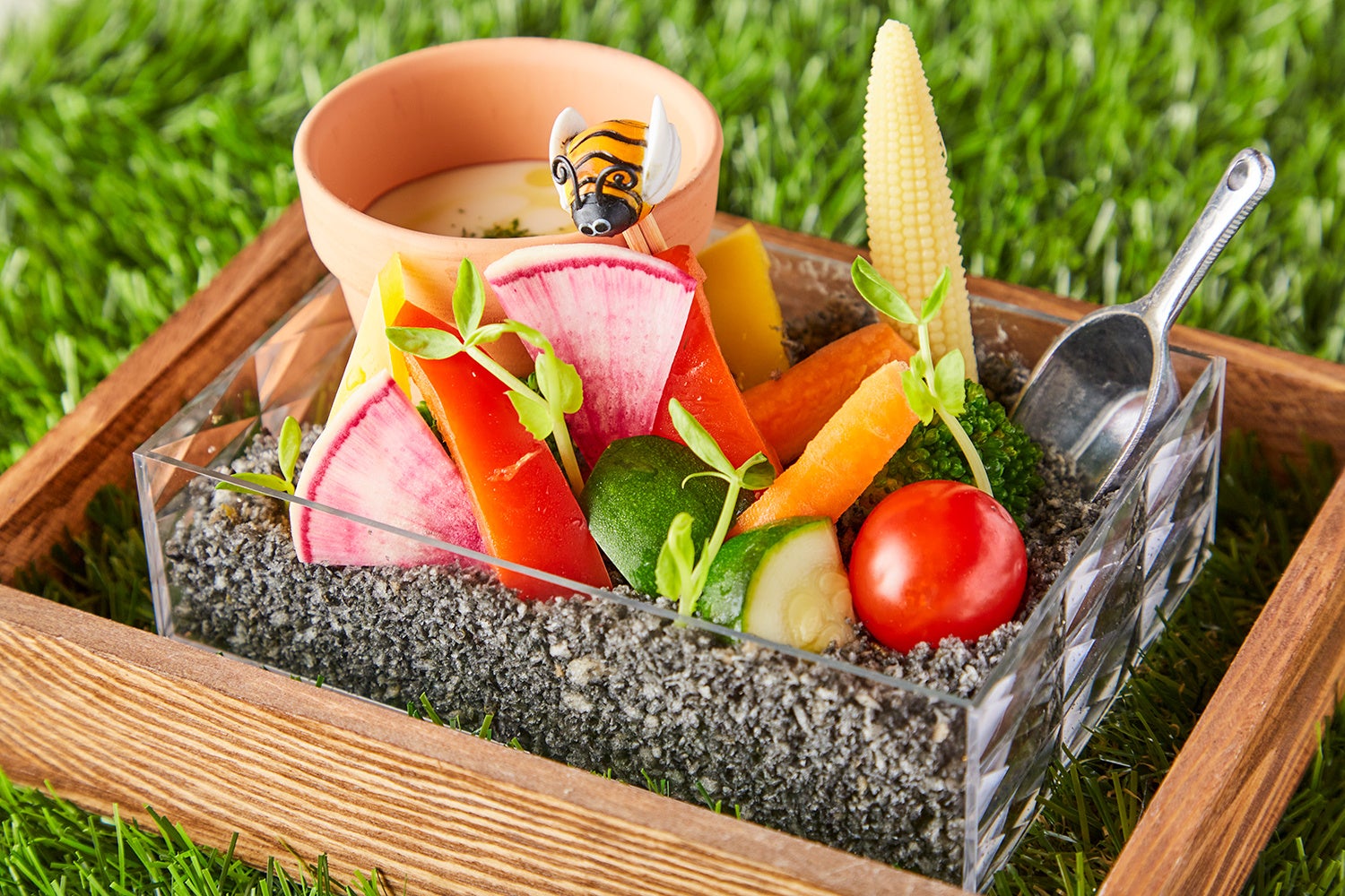 畑をイメージした可愛らしいバーニャカウダです。土に見立てた部分は、パン粉とタプナードで出来ており、お野菜をソースにつけた後にディップすると、楽しい食感でお召し上がりいただけます。