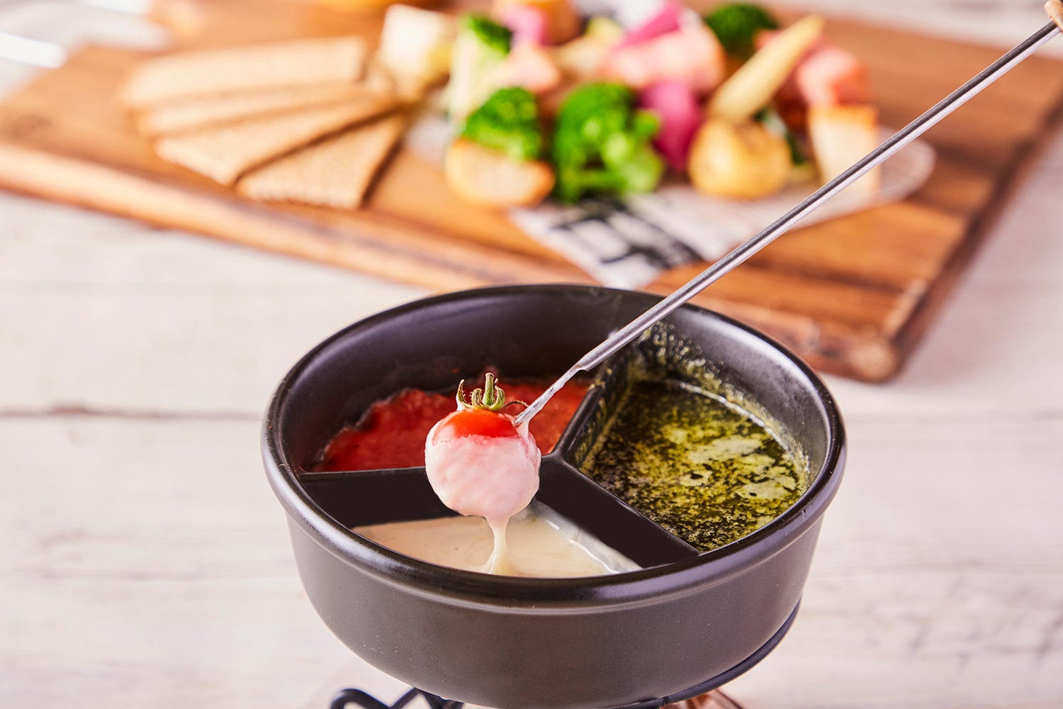 具沢山で色鮮やかな食材を3色チーズソース(オリジナルソース・トマトチーズ・バジルチーズ)をご用意致しました。