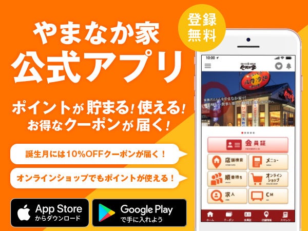 ★来店1回につき1個スタンプ!誕生月はスタンプ2個!!お店でカードを見せると毎回必ず★ちびっこドリンク1杯サービス!★貯まったスタンプ数(3回、5回、7回など)で必ずもらえる特典盛りだくさん!★全部貯まると「やまなか家商品券1,000円分」プレゼント!