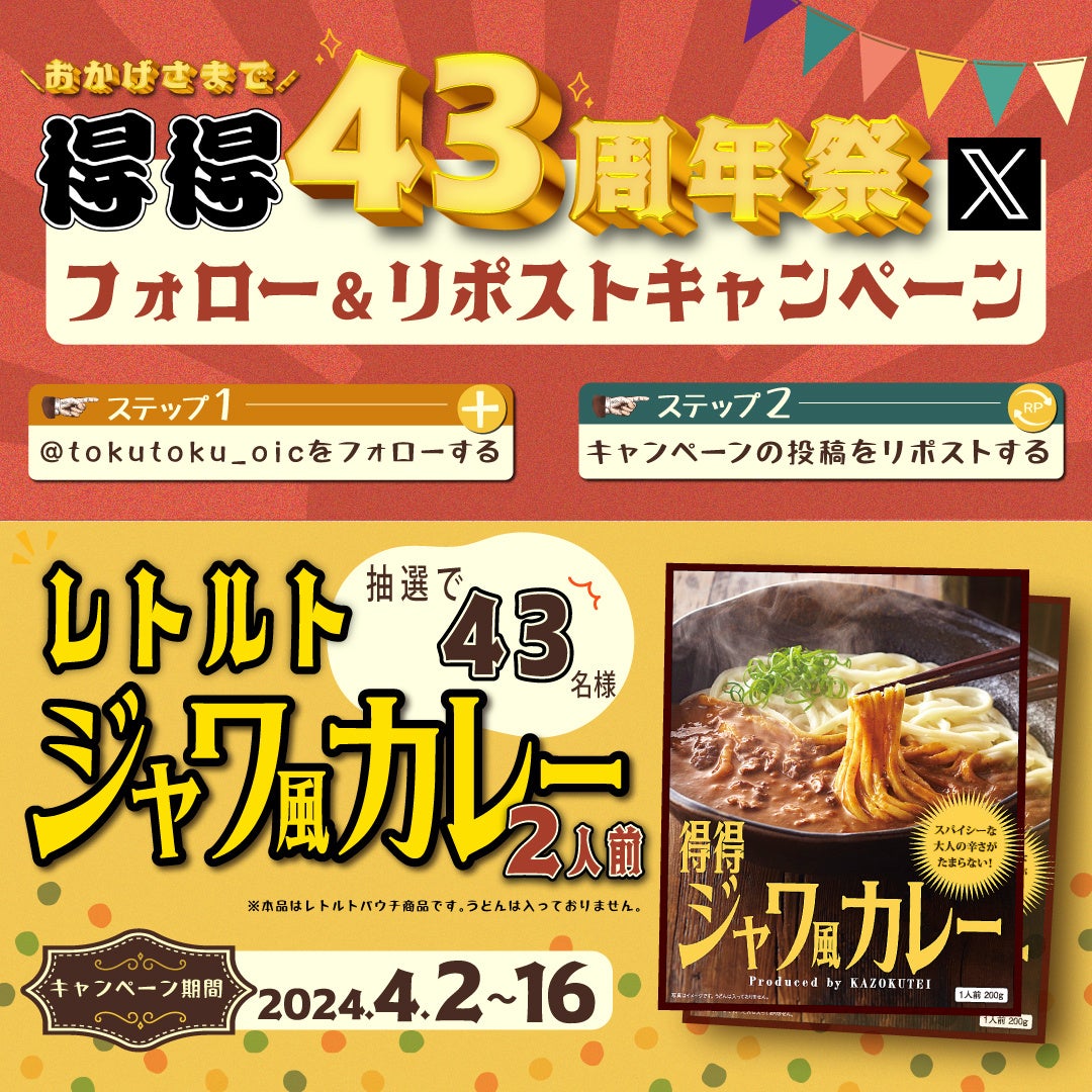 株式会社家族亭(本社・大阪府大阪市、代表取締役社長・坪山 憲司)が運営するうどんチェーン「得得(とくとく)」は、43周年を迎えることができました。これも得得を愛してくれているお客様のおかげです。43周年を記念して2024年4月2日(火)~4月16日(火)の期間に得得公式アカウントで得得オリジナルのレトルトカレー「得得ジャワ風カレー」(2人前)を43名様にプレゼントする「得得公式Xフォロー&リポストキャンペーン」を実施します。得得の公式Xアカウントをフォローし、キャンペーンポストをリポストすることで参加でき、抽選で得得オリジナルのレトルトカレー「得得ジャワ風カレー」(2人前)が当たります。