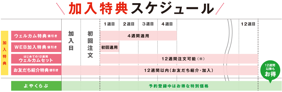 ※加入されたタイミングにより翌週に注文いただけない場合は、加入翌々週の注文から12週間となります。