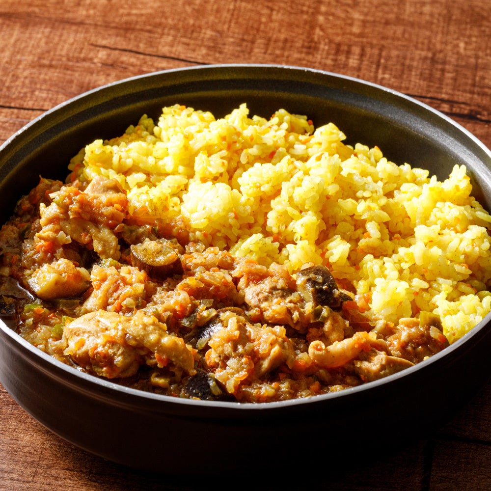 27種類のスパイスやハーブを使用した香り引き立つ本格チキンキーマカレーです。玉ねぎと人参の食感を合わせたターメリックライスと一緒にお召し上がりください。