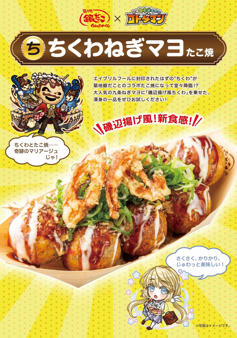 コラボメニュー 「ちくわねぎマヨたこ焼」 は、コラボソース開発会議の際、当社取締役副社長の荻野が、即席で調理したことがきっかけで誕生いたしました。2023年に実施したコトダマンのエイプリルフール企画のイラストをモチーフとした、「ちくわ」 が入った一品です。企画参加者一同で試食し、美味しいたこ焼が完成したため、急遽コラボメニュー展開が決定した商品です。