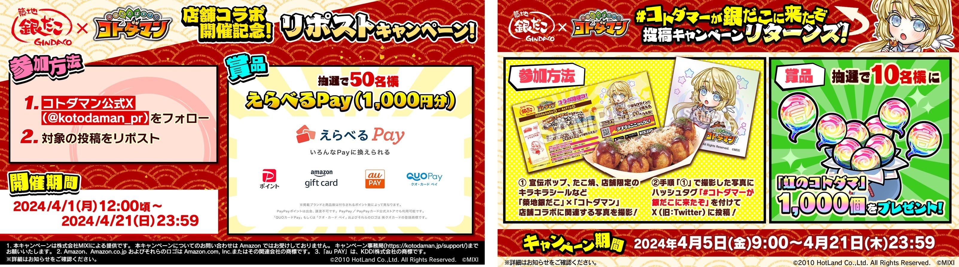 応募方法:キャンペーン期間中、宣伝ポップ、たこ焼、キラキラシールなど「築地銀だこ」×「コトダマン」に関連する写真を撮影し、ハッシュタグ 「#コトダマーが銀だこに来たぞ」 を付けてXにポスト