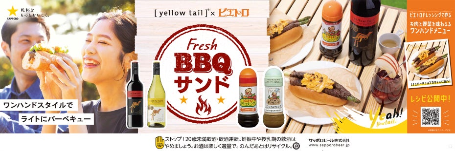 また、[イエローテイル]とドレッシングでおなじみのピエトロがコラボレーションしたオリジナルハンカチタオル付き企画品を4月9日から数量限定発売します。特設サイトでは[イエローテイル]でつくるカクテルレシピとピエトロドレッシングを使ったお肉たっぷりオーストラリアスタイルのBBQサンドレシピ等をご提案しています。ピエトロドレッシングを使ったワンハンドスタイルのBBQサンドと[イエローテイル]の相性は抜群です!