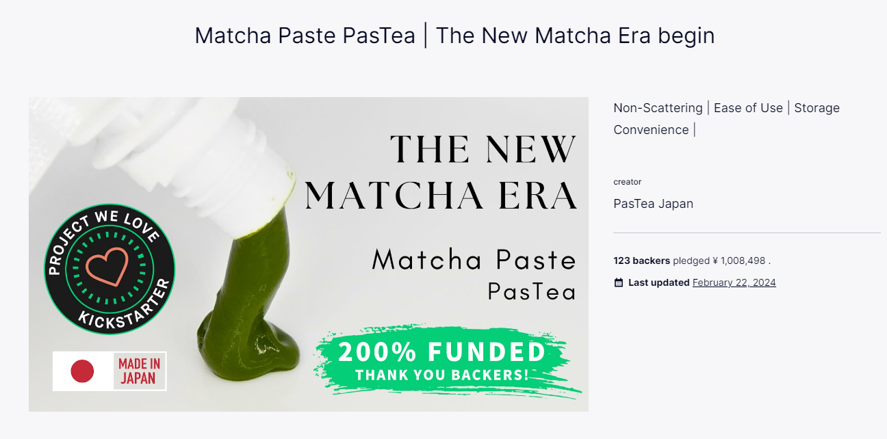 英語圏でのクラウドファンディングプラットフォーム(Kickstarter)を用い、抹茶製品のプロモーションを行いました。運営が選ぶお薦めプロジェクトにも選出され、注目を浴びました。世界中から購入者が殺到し、支援金額は目標金額の300%以上を達成しました。