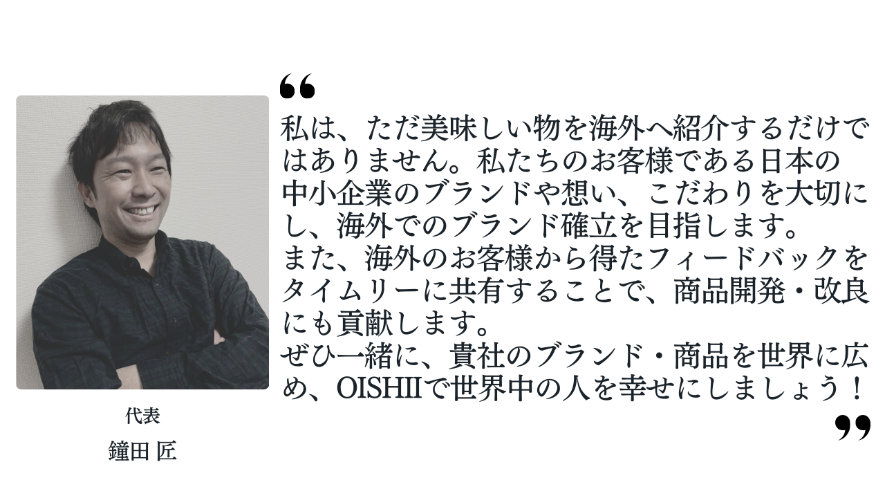 これにより、日本の飲食料品が世界中で購入できるようになり、世界中の人が日本のOISHIIで幸せになります。そして、日本の飲食料品を製造する中小企業の利益率向上に貢献することで、地域を活性化させ、ものづくり大国ニッポンがより輝きを放ちます。