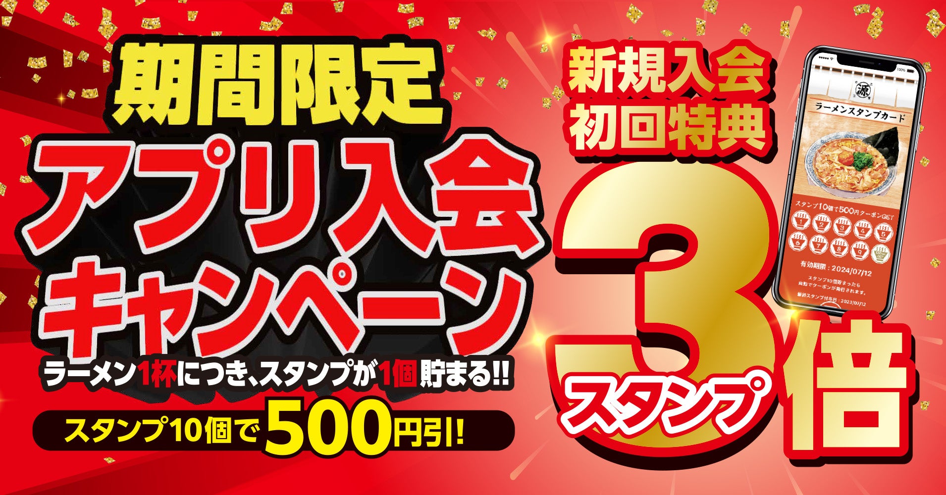 新規入会したお客様の初回特典として、スタンプ3倍になるアプリ入会キャンペーンを期間限定で開催いたします。通常、ラーメン1杯につきスタンプ1個付与されるところ、期間限定でラーメン1杯につきスタンプ3個付与されます。