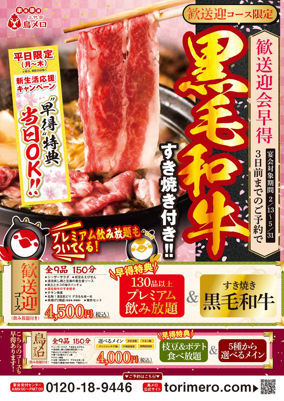 歓送迎会特別コースを平日(月~木)にご予約いただくと、通常飲み放題が約130種類のドリンクが楽しめる「プレミアム飲み放題」に無料でグレードプアップ!(通常+500円/お1人、税込)また、「鳥メロコース」も平日(月~木)のご予約で、「枝豆&ポテトが食べ放題」になる特典をご用意しています。