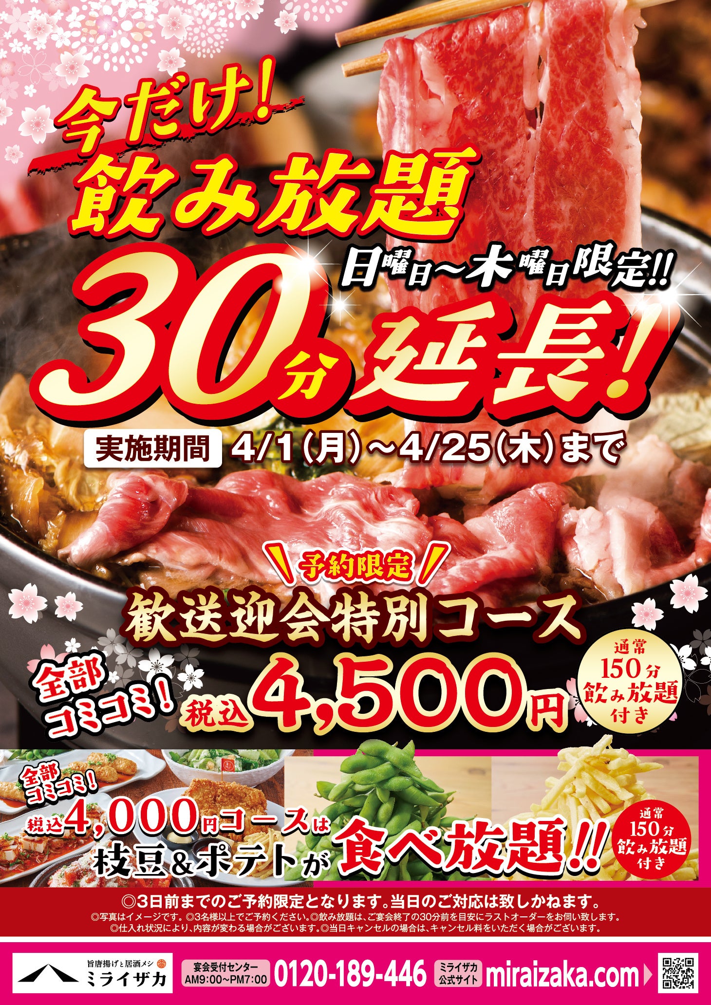 4月1日~4月25日の期間限定でご予約「歓送迎会コース」の全3コースにおいて、