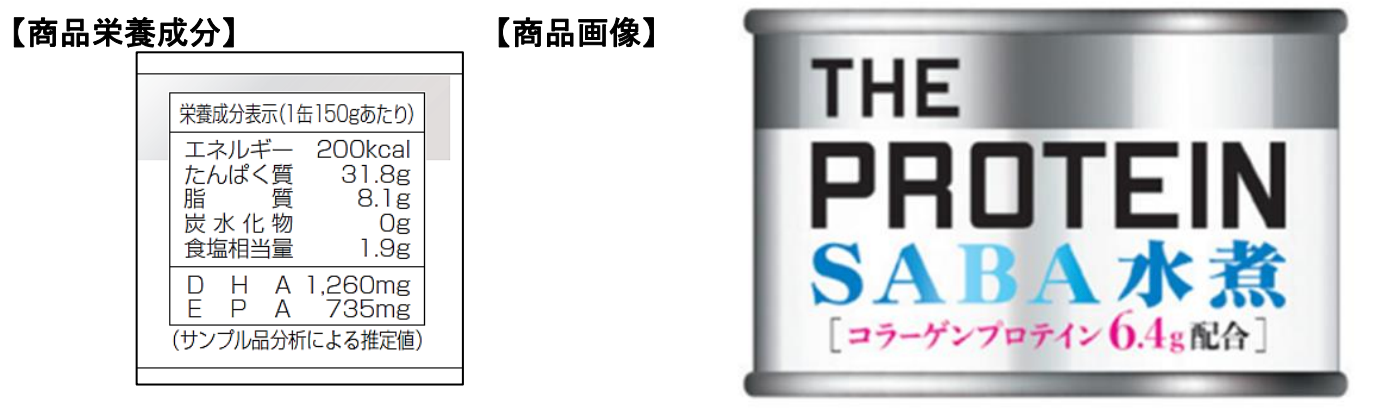 「THE PROTEIN サバ水煮」は、鯖のタンパク質に加えて、コラーゲンプロテインの配合によるたんぱく質含有量の多さと、DHA・EPAなどの健康成分を前面に訴求し、従来のサバ缶詰の常識を一新した新商品です。