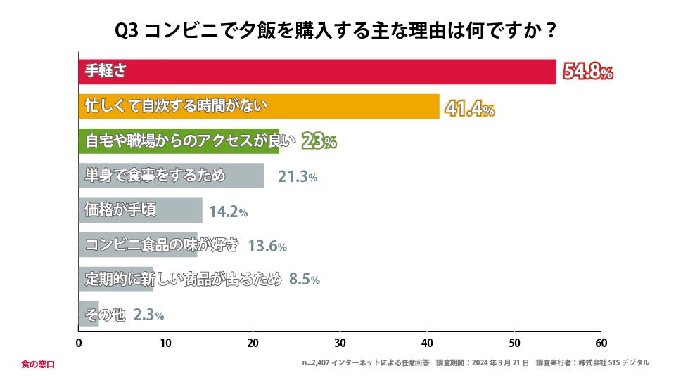 最も多い回答は「手軽さ」で54.8%、次点で「忙しくて自炊する時間がない」が41.4%でした。