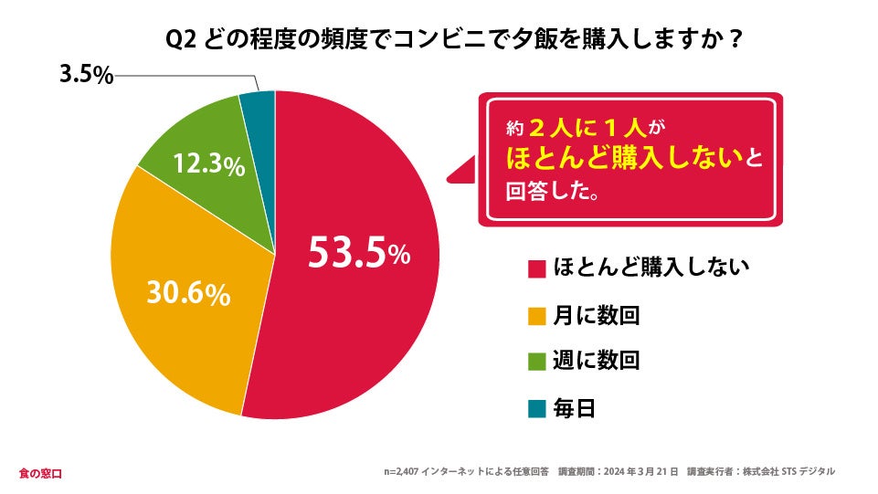 Q2 コンビニで夕飯を購入したことがある人でも53.5%の人は「ほとんど購入しない」と回答、「毎日」と回答した人は3.5%でした。