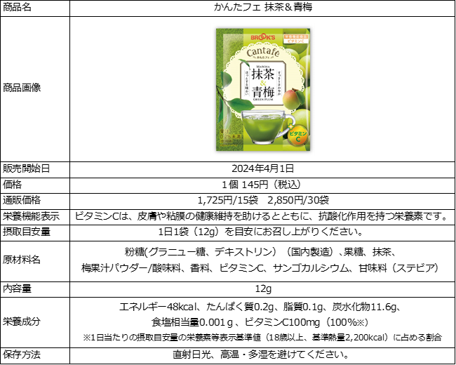 ブルックスでは創業以来、食を通じて「健やかな日常」を考え続ける中で、2013年より「おいしさのその先へ」を掲げ、様々な未病改善事業に取り組んでおります。その中でも、「かんたフェ」シリーズでは、からだにうれしい健康素材を取り入れた商品を現在までに8種類展開しております。冷たい水でサッと溶ける新感覚かんたフェとして発売した『抹茶&檸檬』は、抹茶の清涼感とレモンのさわやかな酸味がマッチしたリフレッシュティーで、初夏から盛夏にかけて、毎年ご好評いただいております。