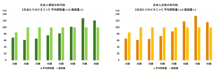 18歳以上のビタミンC摂取における推奨量は1日当たり100mgと示されています。厚生労働省の調査によると、ビタミンCの1日平均摂取量は10-50代の男女ともに推奨量を満たしていません。ビタミンCは、皮膚や粘膜の健康維持を助けるとともに、抗酸化作用を持つ大切な栄養素です。そして、肌のハリを保つコラーゲンを体内で合成するときにも必要です。しかし、人の体内で作られないビタミンCは、毎日食品から摂取する必要があります。『かんたフェ 抹茶&青梅』を飲んで、1日分のビタミンCを手軽に摂取しませんか?