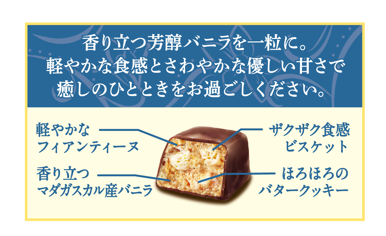 ほろほろのバタークッキーやサクサクのフィアンティーヌを組み合わせた軽やかな食感とともに、マダガスカル産バニラの芳醇な香りと甘さが広がり、あたたかくなるこれからの季節にもぴったりな商品です。