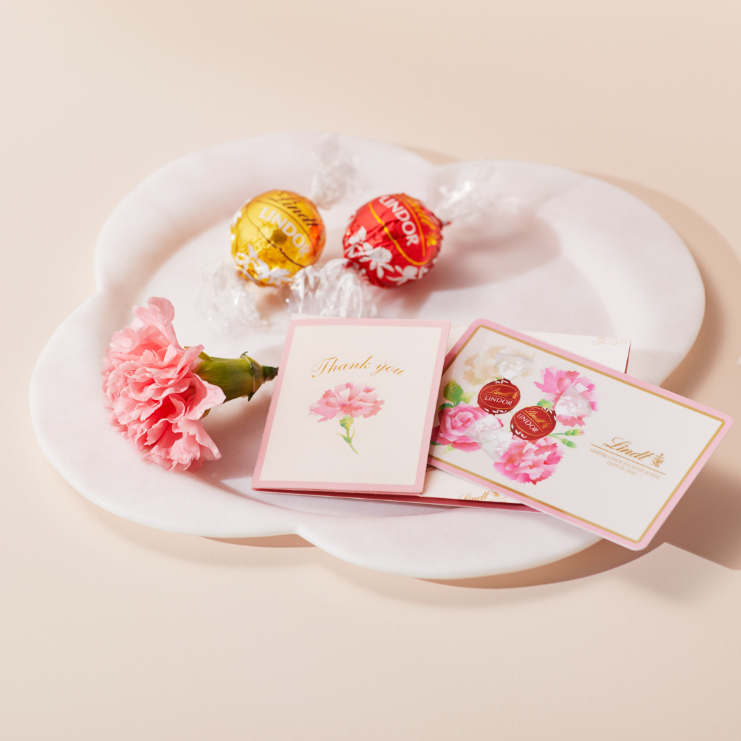 パッケージにカーネーションが描かれたリンツの母の日コレクションと、ブルーミーの花束を組み合わせて、より一層華やかな母の日ギフトをお楽しみください。