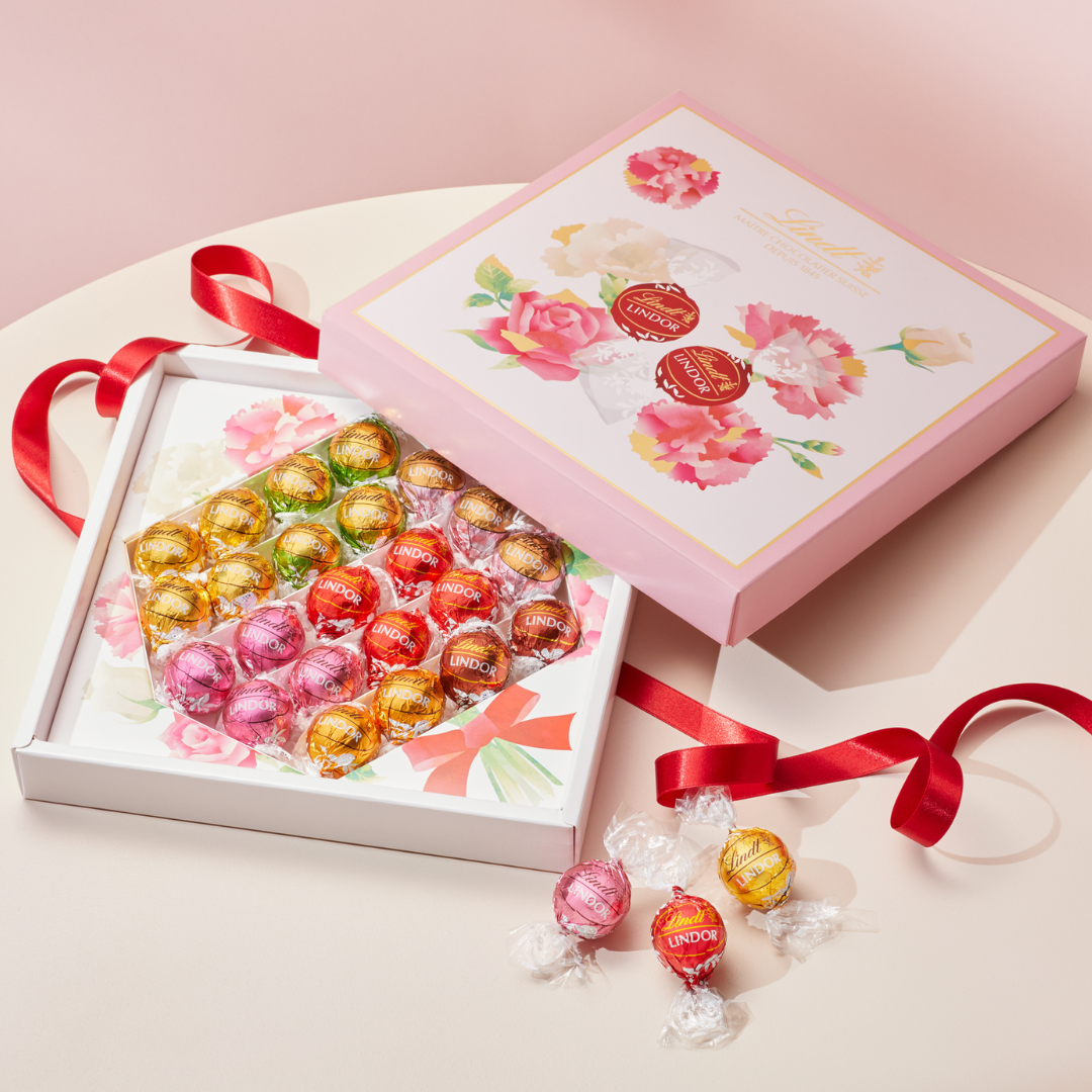 一番人気の赤い「ミルク」をはじめ、「ストロベリー」や「抹茶」、期間限定リンドール「ナポリタン」など全7種類のフレーバーのリンドールを24個詰め合わせました。パッケージには華やかなカーネーションと、まるで親子のように寄り添った2つのリンドールをあしらった温かみのあるデザイン。箱を開けると、フラワーブーケのように詰め合わされたリンドールがお出迎え。くちどけなめらかなリンドールで作られたブーケは、サプライズ感もあって母の日の贈り物にぴったり。日頃の感謝の想いをリンドールにのせ、お母さんにご褒美を贈りませんか。
