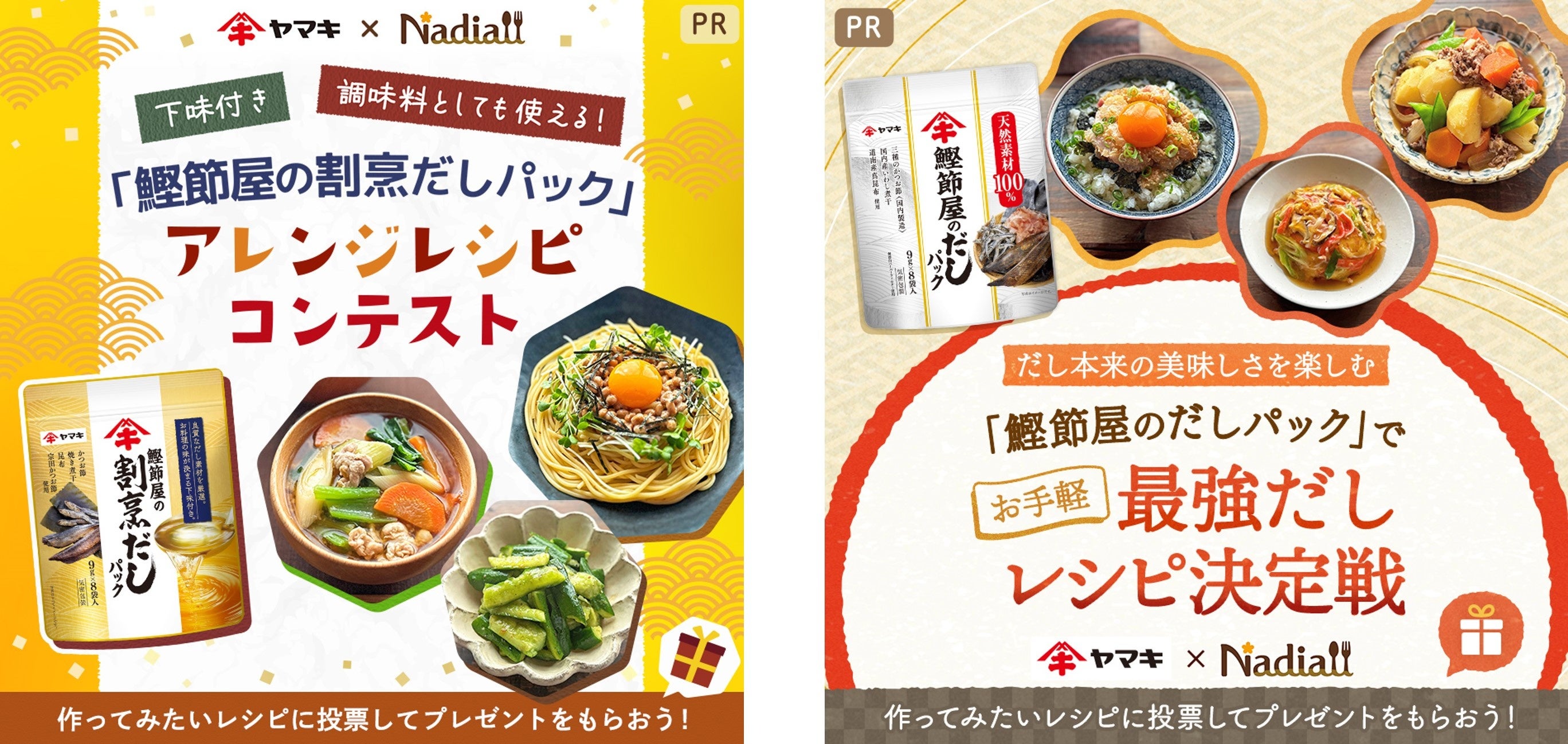 今回の企画では、【「鰹節屋の割烹だしパック」アレンジレシピコンテスト】と【「鰹節屋のだしパック」最強だしレシピ決定戦】の2つのコンテストを同時に開催します。 Nadia Artist(料理研究家)が各コンテストにおけるレシピをNadiaサイトにアップ。レシピ投稿の中から、会員ユーザーが作ってみたいと思ったレシピに投票することによりグランプリが決定します。