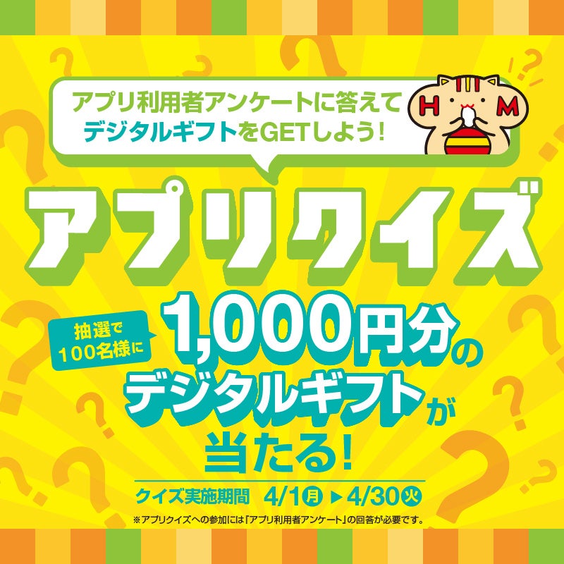 このたび「ほっともっと」では、ほっともっと公式アプリ限定のキャンペーン「アプリクイズ」を4月1日(月)より実施中です。アプリ利用者アンケートに答え、「アプリクイズ」に参加した方の中から抽選で100名様にデジタルギフト1,000円分が当たります。
