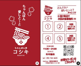 6ポイント獲得で次回来店でちゃんぽん類、皿うどん、焼きそば類が1食無料サービスとなるスタンプラリーを実施しております。