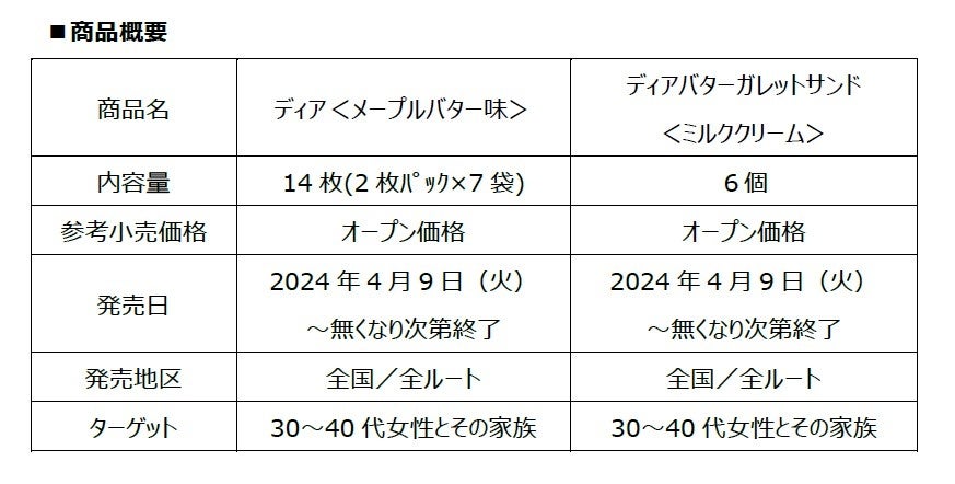 「ディア<メープルバター味>」は、バタ―のコクとやさしいメープルの味わいが特徴のビスケットです。ビスケットには、気持ちを伝える「THANK YOU☆」などのメッセージの絵柄をデザインしました。「ディアガレットサンド」は、バターがふんわり香るガレットでコクのあるミルククリームをサンドしました。