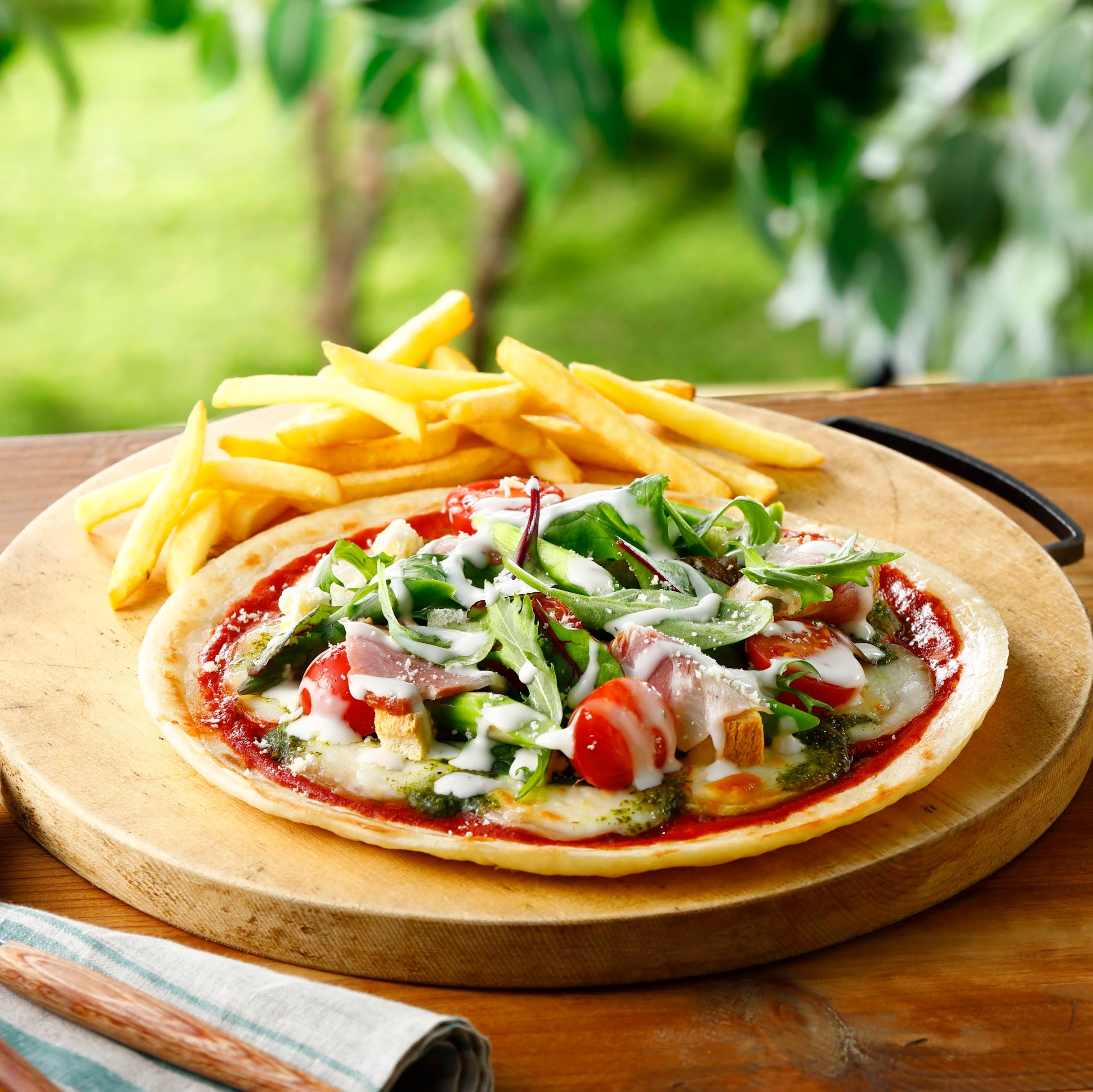 季節限定フードメニューに彩り豊かなピザが新登場します。トマトソースをベースに、モッツァレラチーズとバジルソースをのせたクリスピー生地のピザをこんがりと焼き上げました。上にはグレープシードオイルであえたベビーリーフやアスパラ、モモベーコンなどをのせ、仕上げにシーザーサラダドレッシングや粉チーズ、クルトンをトッピング。サラダ感覚でお楽しみいただける食べ応えのあるピザです。色とりどりの具材の中でも、野菜がメインとなっているためさっぱりとお召し上がりいただけます。ポテトもついていますので、ぜひあわせてお楽しみください。
