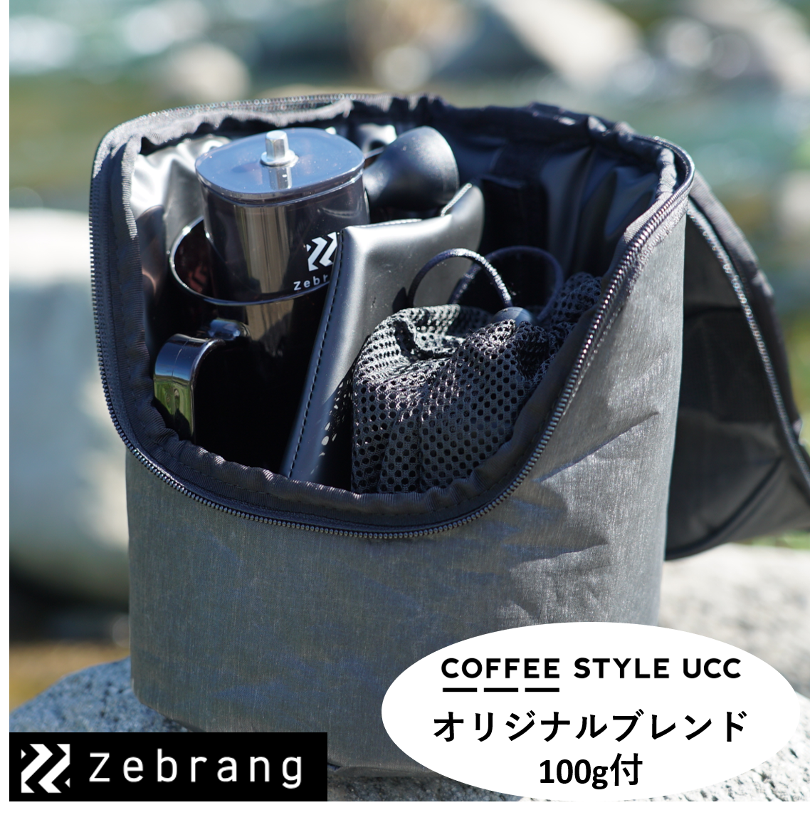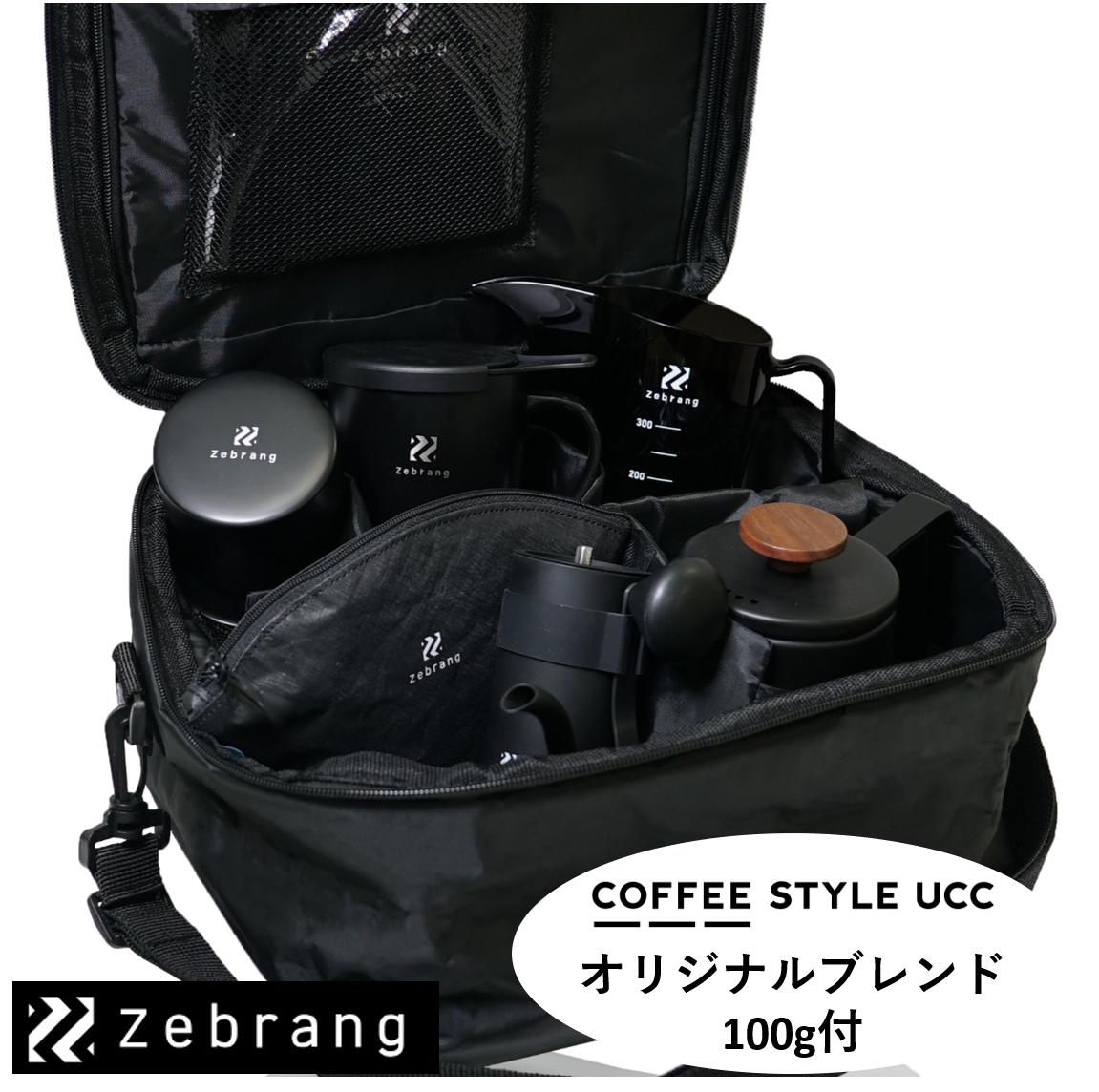 HARIOのアウトドアブランド「Zebrang」のギア8種とCOFFEE STYLE UCCのオリジナルブレンド100gが入った、外でも本格ハンドドリップにこだわりたい方におすすめのセットです。