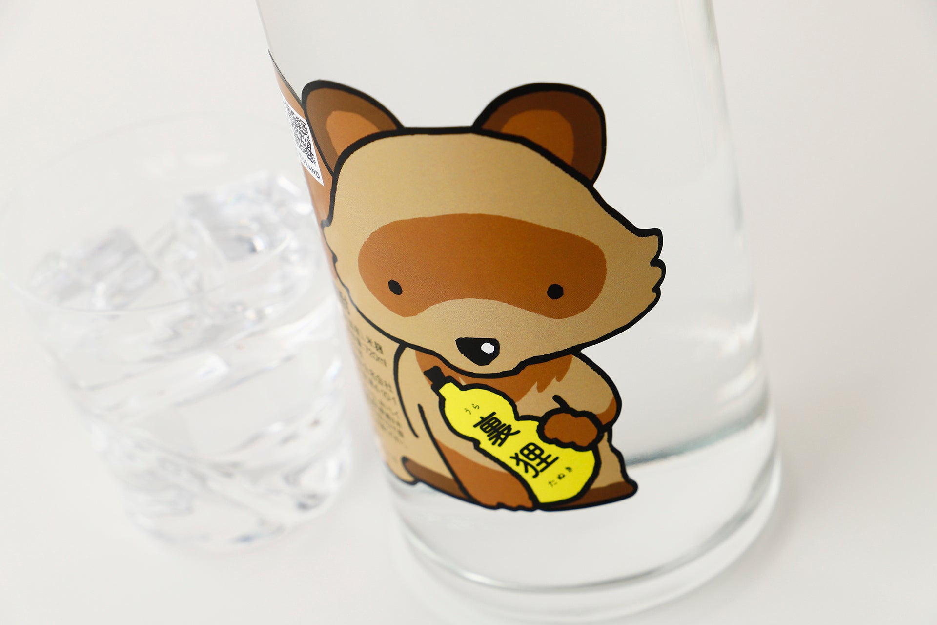 ラベルの裏に上機嫌なほろ酔い気分の狸が出現