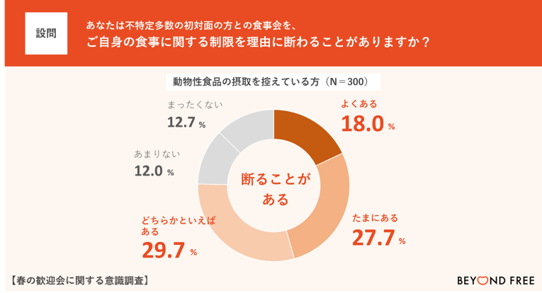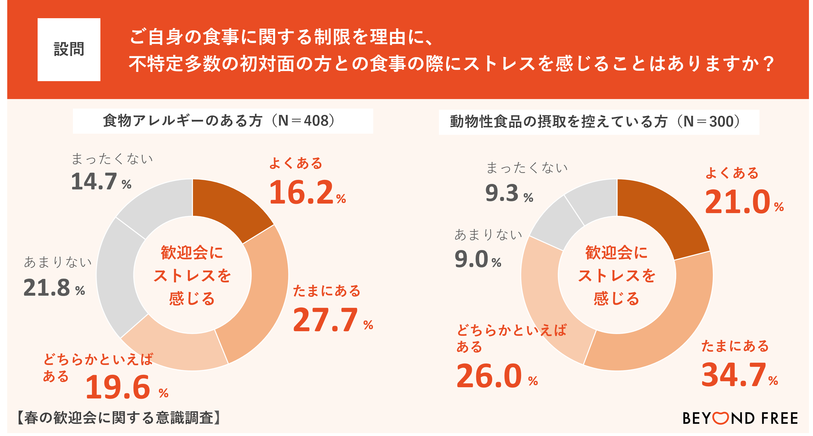 BEYOND FREEでは、これまでイベント等のさまざまな活動を通してご自身の体質や主義・信条等を理由に食に関する制限がある方との対話を行ってまいりました。そしてこの度、多数の初対面の方との食事の機会が増える歓迎会シーズンに焦点をあて、春の食事会で抱えやすい悩み・想いを探るべく、食物アレルギーのある方・動物性食品の摂取を控えている方・目立った食事の制限がない幹事経験者の方 計800名を対象にインターネットによる意識調査を実施いたしました。