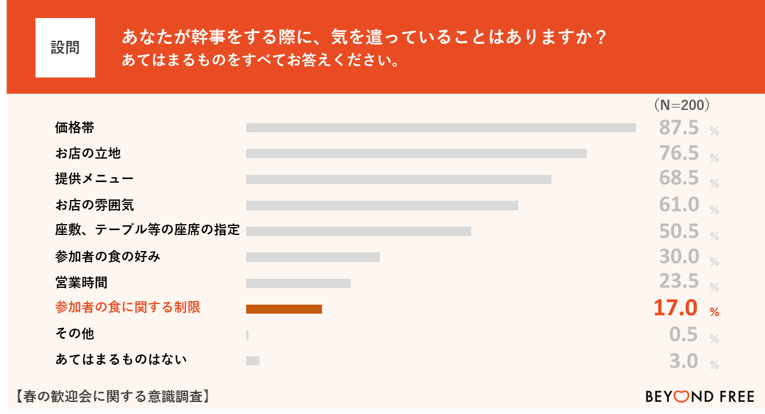 本調査では、食事に関する制限がなく、これまで食事会の幹事を経験したことがある方にも調査を実施。約70%以上の幹事経験者はお店を選ぶ際「価格帯」「お店の立地」「提供メニュー」に気を遣っている一方で、「参加者の食に関する制限」に関しては、83%の方が気を遣っていないことが判明いたしました。