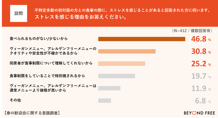 食に関する制限のある方のうち68.6%の方は、ご自身の食事に関する制限を理由に、初対面の方が集まる食事の際に「ストレスを感じる」と回答。食物アレルギーのある方では63.5%の方が、動物性食品の摂取を控えている方だけの調査では81.7%の方が「ストレスを感じる」と回答しました。