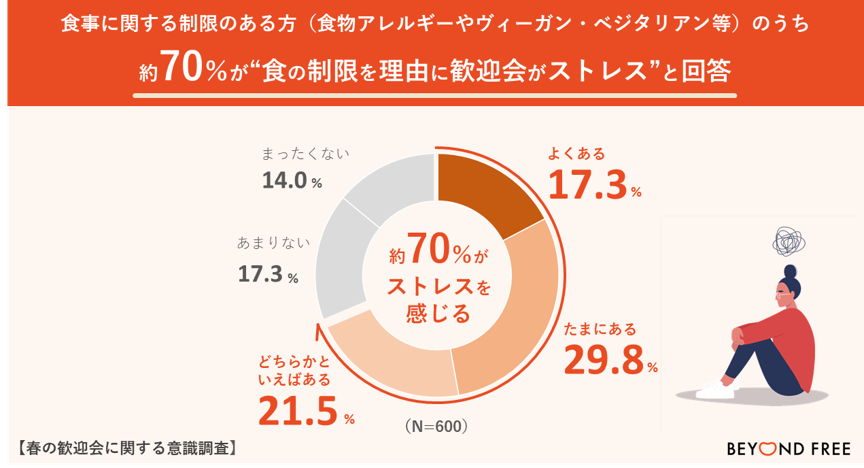 ①食に関する制限のある方の68.6%が食事会に対して「ストレスを感じている」ことが判明