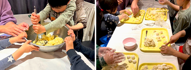 当イベントでは、こどもたちと大人が一緒に、イタリアの伝統的な料理であり、家庭でもよく食べられている「じゃがいものニョッキ作り」を体験しました。茹でたじゃがいもをすりつぶすところから始める本格的なニョッキ作りを、こどもたちは互いに協力しあいながら一生懸命に取り組んでいました。また、「あきないたいけん」では、こどもたちがじゃがいものニョッキのお弁当を作り、大人と感動こどもマネー(擬似通貨)を交換する「商売体験」も行いました。