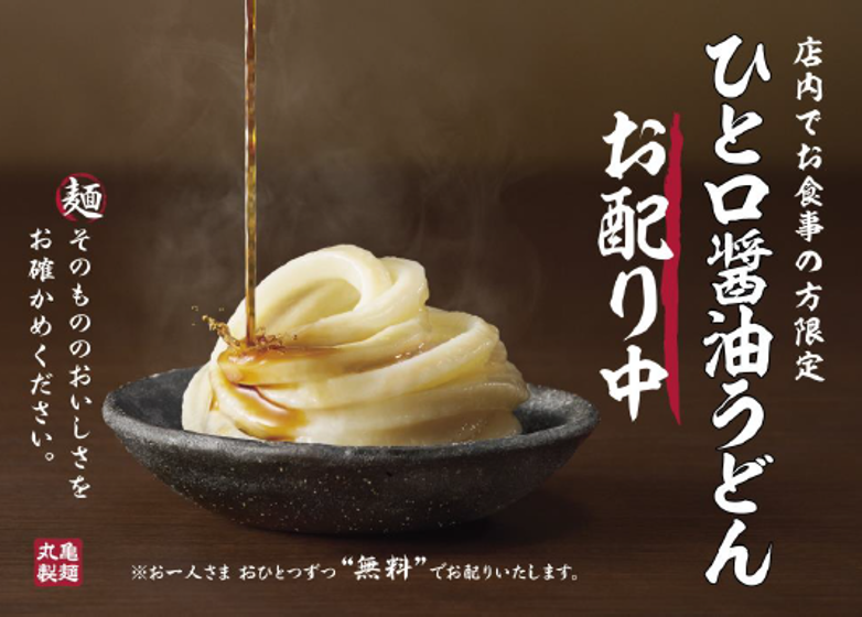 日本全国のすべての店への麺職人配置完了を記念し、職人たちが打つ麺そのもののおいしさをより多くの方に実感いただきたいという想いから、この度初めて全国の丸亀製麺にて「ひと口醤油うどん」を2024年4月9日(火)から11日(木)までの3日間限定で実施いたします。店内でお食事の方全員にお一人様おひとつ無料でご提供いたします。
